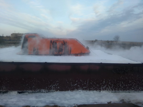«К месту испытания прибыла пожарно-спасательная часть пгт. Приморский ГКУ РК «Пожарная охрана Республики Крым». После проведения испытаний спасательной шлюпки из стеклопластиковых материалов, огнеборцы провели боевое развертывание и подали воду в очаг возгорания. Контролируемое возгорание было оперативно ликвидировано», - отметил Министр.