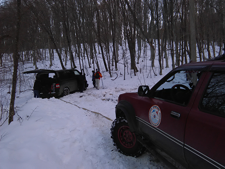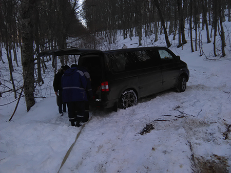 Уже в 17:02 оперативному дежурному г. Симферополь поступила информация о том, что на грунтовой дороге, в районе поляны Барсучья на плато Чатыр-Даг в снежном перемете застрял автомобиль ВАЗ 2121, требуется помощь в его буксировке. К месту происшествия направилась группа спасателей Симферопольского отряда «КРЫМ-СПАС» в составе 5-ти чел. и 2 ед. техники. Прибыв к месту происшествия, при помощи такелажного снаряжения спасатели осуществили буксировку автомобиля до проезжей дороги.